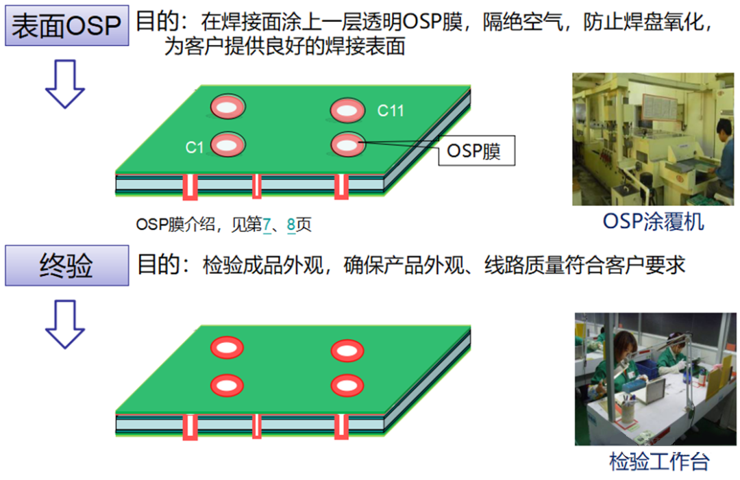 1.OSP工藝:OSP意為可悍性有機(jī)銅面保護(hù)劑,其制程原理是通過一種替代咪唑衍生的活性組分與金屬銅表面發(fā)生的化學(xué)反應(yīng),使線路板的焊盤和通孔焊接位置形成均勻,極薄,透明的有機(jī)涂層,該涂層具有優(yōu)良的耐熱性,保護(hù)膜厚度通常0.2-0.5μm。