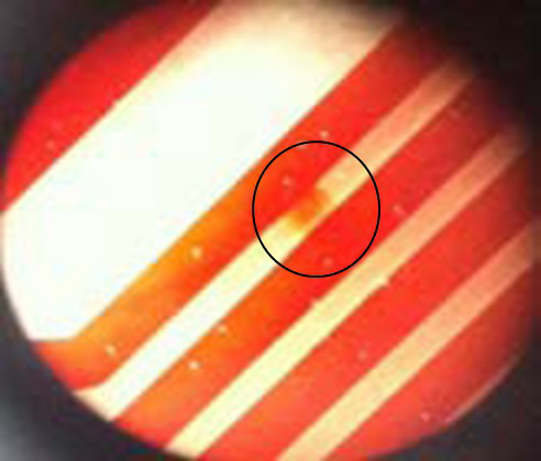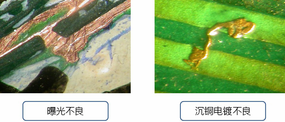 此不良為線路生產(chǎn)用黑菲林復(fù)制黃菲林時(shí),曝光機(jī)上麥拉上有黑點(diǎn)未清潔干凈,導(dǎo)致復(fù)制出來的黃菲林上有暗線,黃菲林對(duì)位曝光菲林上的暗線形成定位短路不良
