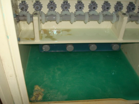 2、原因分析:酸水洗槽后段的水洗槽有一自動(dòng)補(bǔ)水的裝置,但由于作業(yè)員的疏忽,這個(gè)開關(guān)在生產(chǎn)時(shí)沒有被打開,使水槽的水無法通過溢流口流動(dòng),使磨刷輪后段過濾網(wǎng)堵塞,致使馬達(dá)過載,導(dǎo)致馬達(dá)自動(dòng)跳閘,控制顯示燈之前有壞掉(正常作業(yè)未全部亮燈),水洗槽停止作業(yè),操作員沒有及時(shí)發(fā)現(xiàn),導(dǎo)致水洗槽里面的酸濃度越來越高,故微蝕液留在板面,帶到輸送滾輪和吸干海綿棒上,致使酸液越沉積越多的存留在輸送滾輪和海綿棒上;