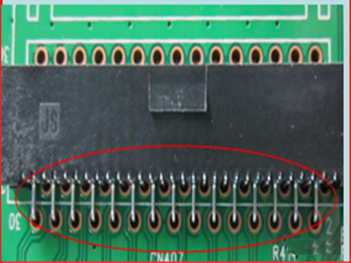 2、原因分析:不良因?qū)賰煞矫娴木C合因素引起的,PCB板的個(gè)別板板塞孔過于飽滿,造成板面油墨略厚,與PAD的焊盤形成一定的落差,由于測(cè)試PAD的面積較小,在焊接過程中,上限的OSP膜厚度在浸錫前較難分解,造成吃錫不良現(xiàn)象