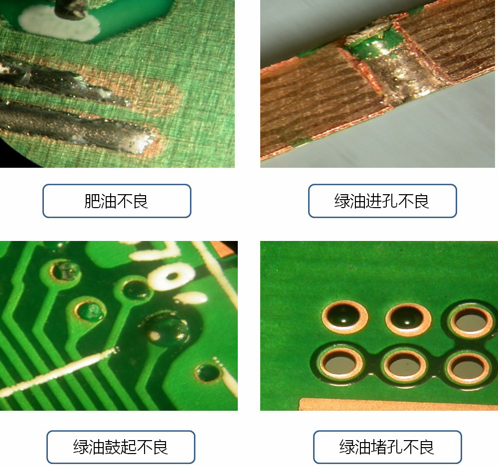 2、原因分析:6月17號(hào)因曝光房空調(diào)故障,室內(nèi)溫度比較高,溫度高達(dá)28.7℃(標(biāo)準(zhǔn)濕度:22±5℃,平時(shí)一般控制在20-24℃左右),在印刷時(shí)孔口處油墨相對(duì)較?。ㄒ蚩卓谂c孔壁會(huì)形成角度,所以在印刷時(shí)拐角處油墨會(huì)相對(duì)較薄且會(huì)滲透至孔口),故在預(yù)烤OK后將板放置在曝光房待生產(chǎn)時(shí)時(shí)間過長(zhǎng),沒有管制放置時(shí)間,因室內(nèi)溫度較高,導(dǎo)致焊環(huán)邊上的油墨會(huì)烤死固化,最終在顯影時(shí)有一層薄薄的綠油殘留在焊環(huán)上不易顯影掉,形成孔口有綠油,進(jìn)而造成波峰焊不爬錫